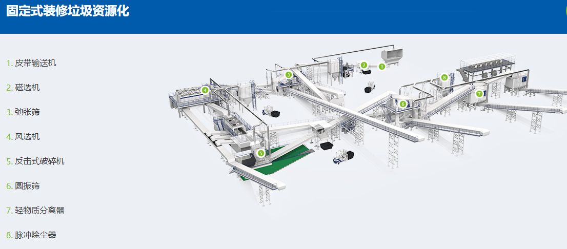 装修垃圾处理目前成熟且广泛应用的是 “两级破碎+多级分选” 工艺。通过破碎、筛分、磁选、风选、光选甚至AI识别等组合技术,分离出金属、木材、塑料等,最终得到纯净的再生骨料。而除了再生骨料的应用,分离出的木材、塑料、纸张、纺织品等轻物质的资源化优势也正在逐渐凸显。