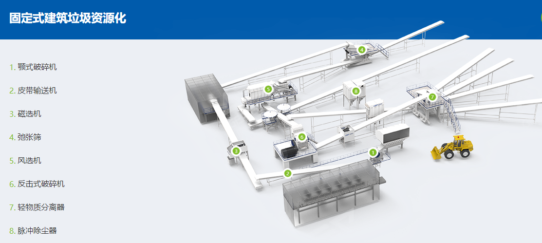 | 第一阶段: | 1. 两级破碎 | 粗破机(颚式破碎机等)、细破机(反击式、锤式破碎机等) | 将大块装修垃圾破碎至<50mm的均匀粒径,为高效分选创造条件。 | 控制粒径是关键,过细则增加粉尘,过粗则分选不彻底。 |